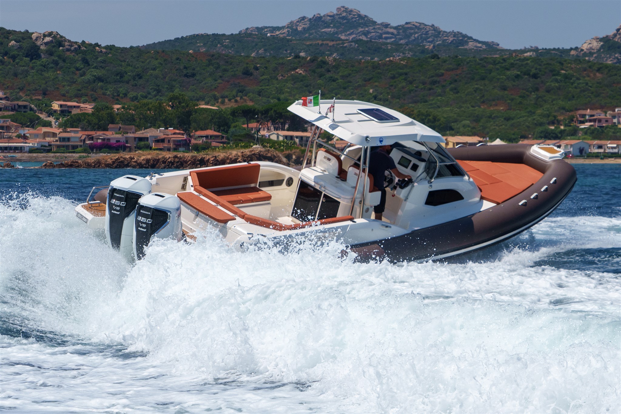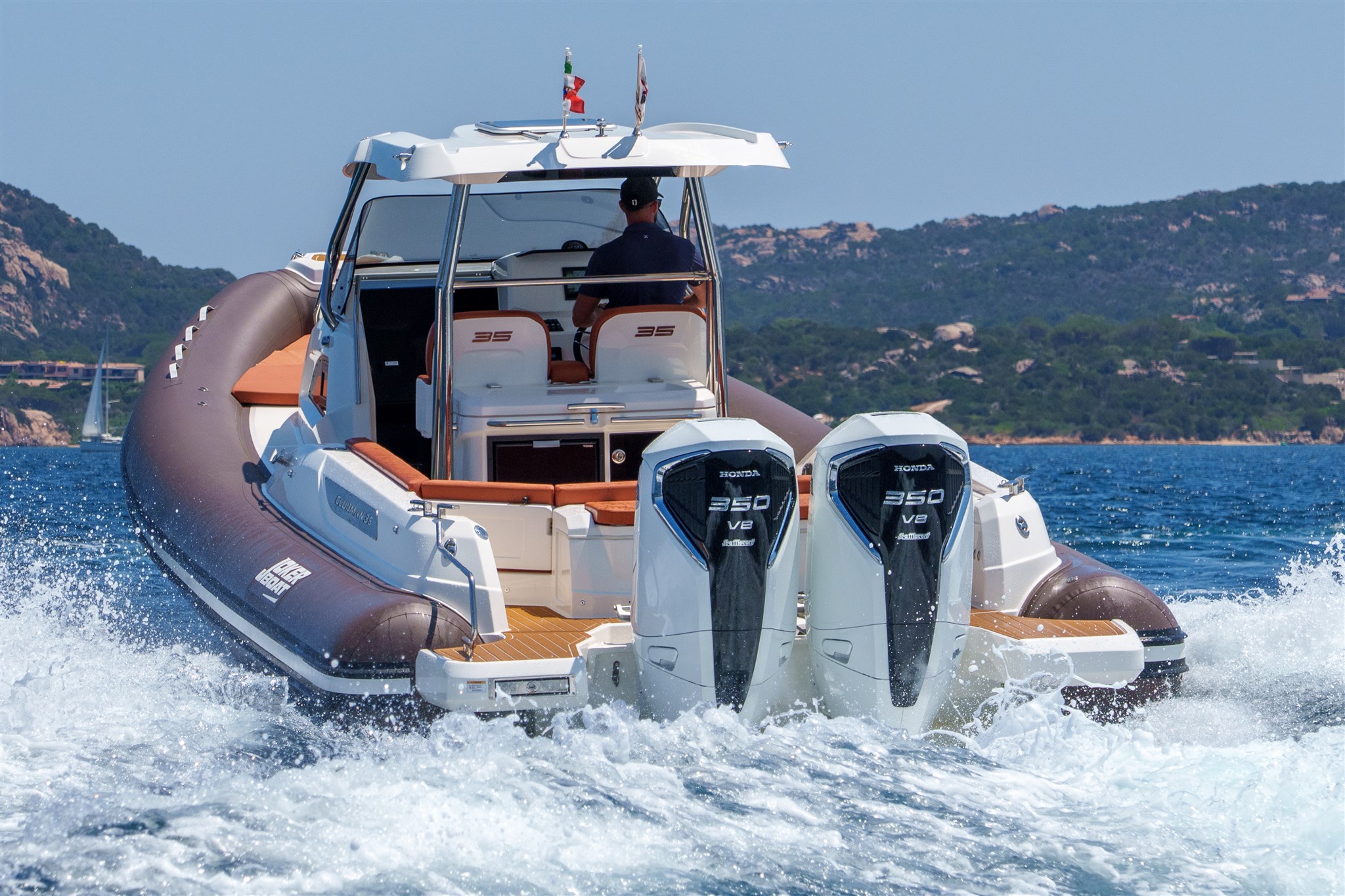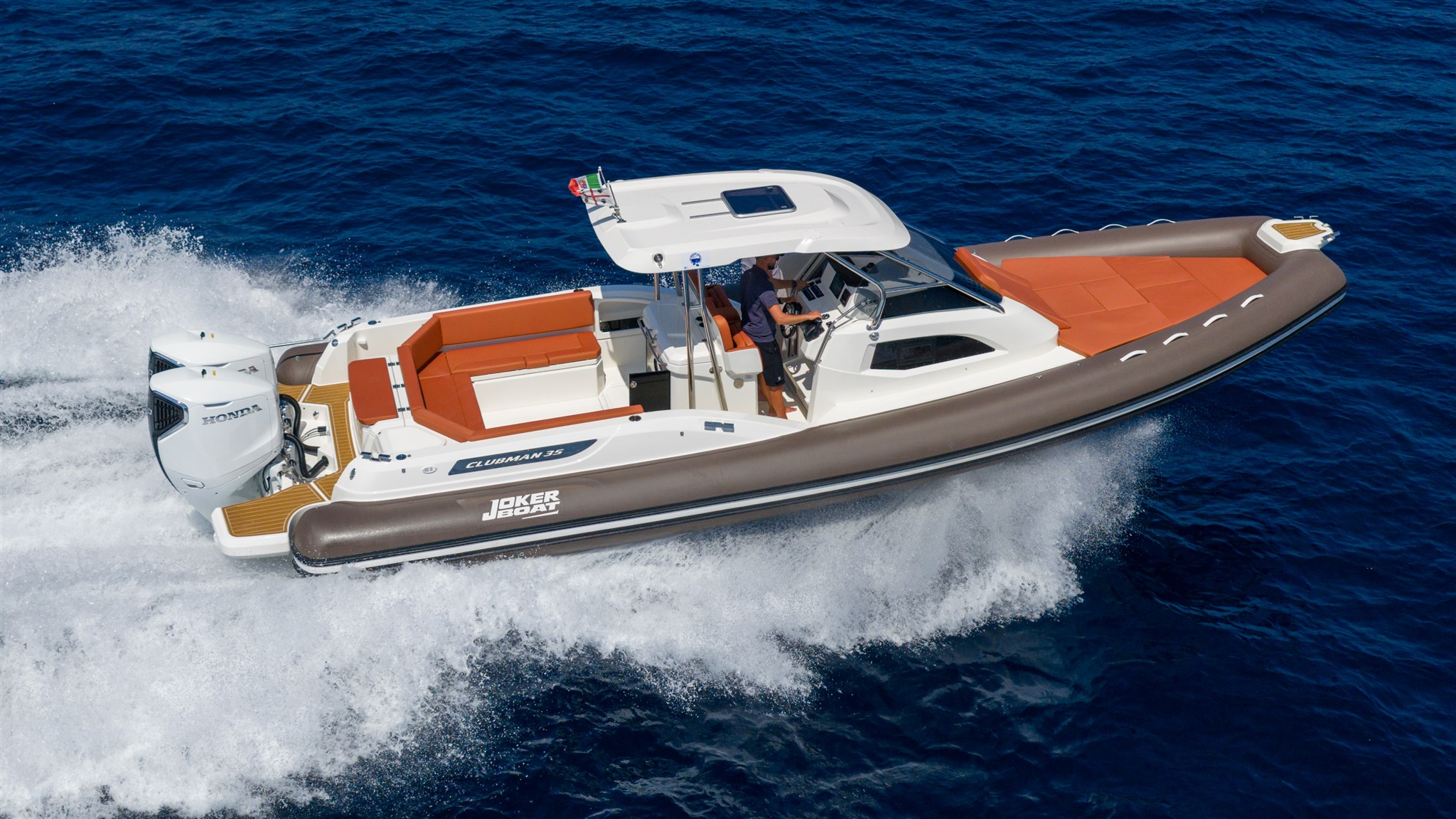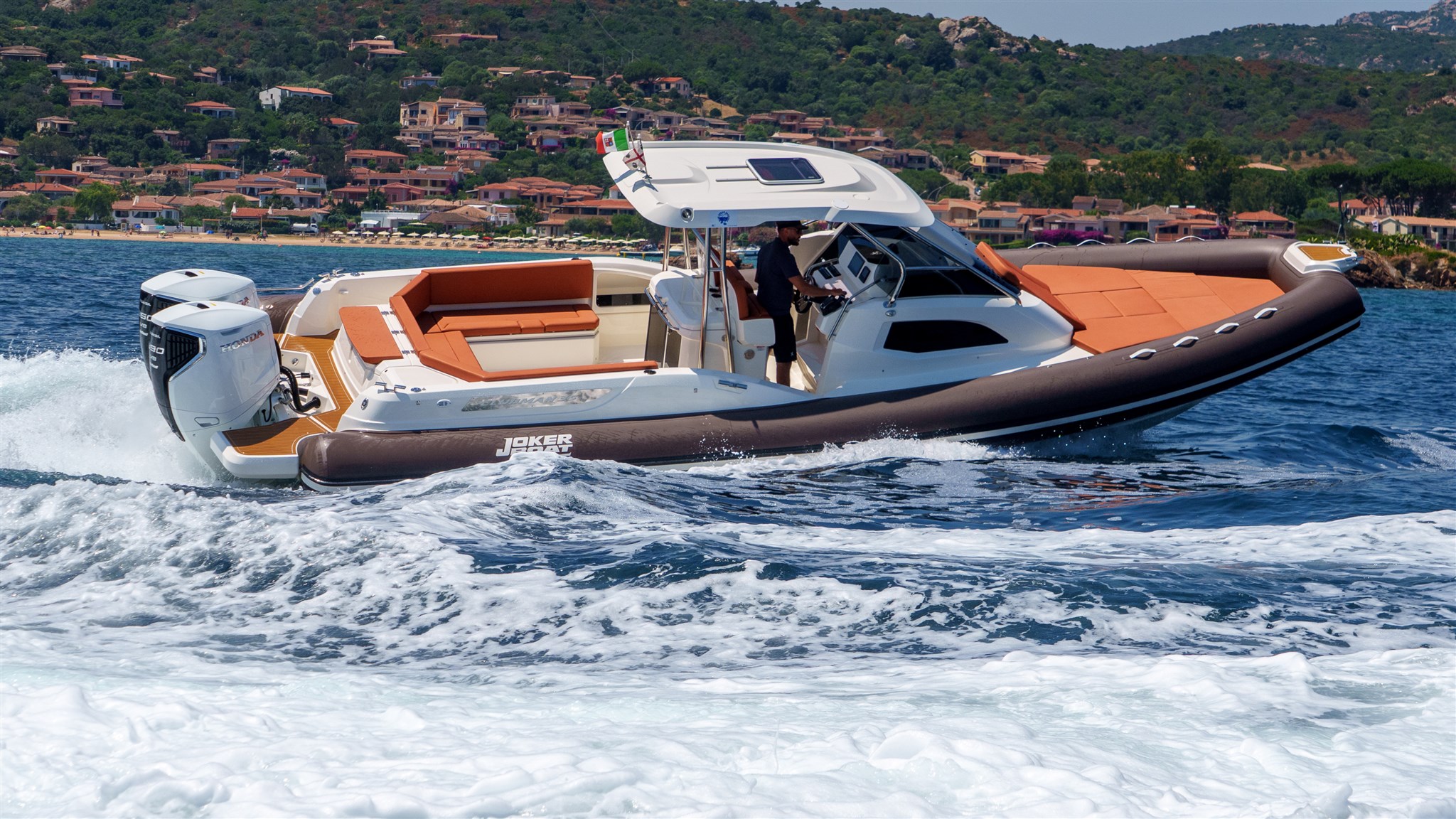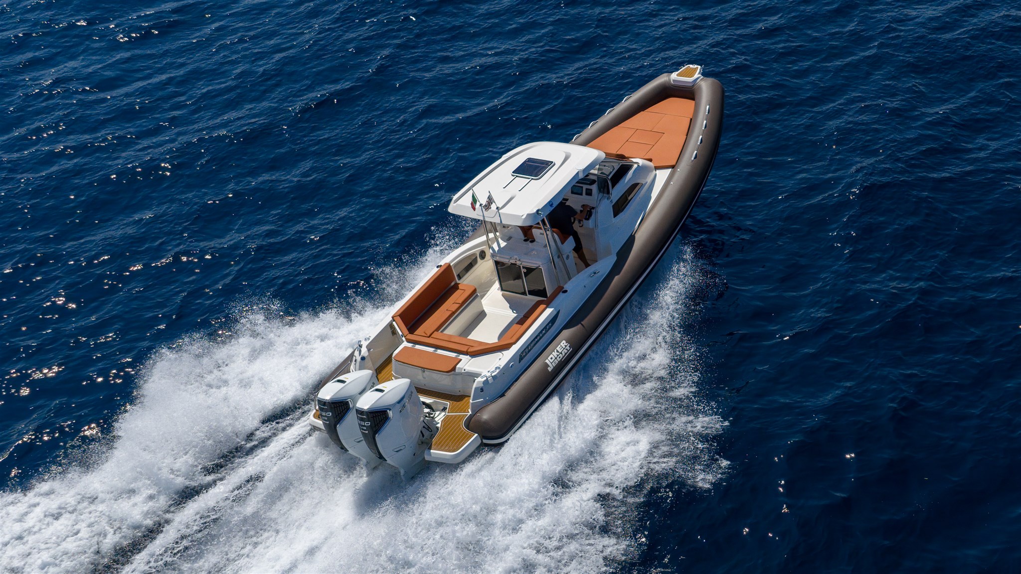 Offerta Centro Nautico Lignano per un nuovissimo gommone Joker Boats 35 Clubman con 2 motori Honda Marine BF350 Total White, colore tubolari a scelta, completo di accessori sta cui: Casse audio nr. 6, Carica batterie 12V, 4' AMP con presa e cavo banchina, Certificato CE, Colore Carena, Consolle con parabrezza, Cuscineria prendisole e sedili di guida, Ganci per sospendite, Ganci sci, Gonfiatore elettrico, Impianto doccia, Kit riparazione, Luci di navigazione, manuale utente, pagaia con mezzo marinaio, Pannello utenze 16 funzioni, Pompa di sentina x 2, Scaletta a incasso inox, Segnalatore acustico, Serbatoio acqua 170 lt, Serbatoio carburante inox 700 lt, Blower, Tavolo elettrico, Cuscino prolunga prendisole, Tientibene in console, Verricello elettrico con ancora e catena. Cassone Guida: lavello, tagliere, frigorifero 75lt, Pattumiera.