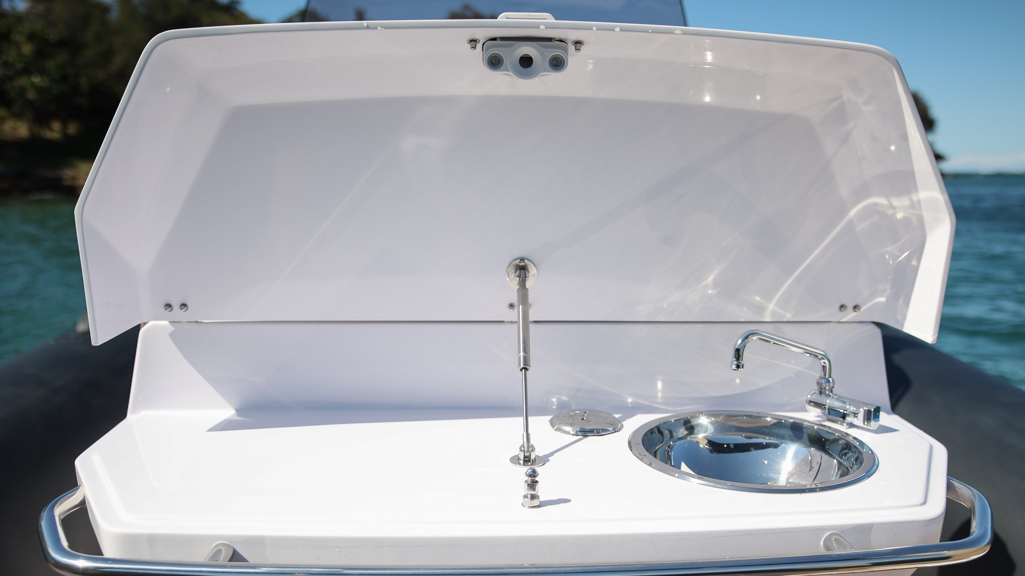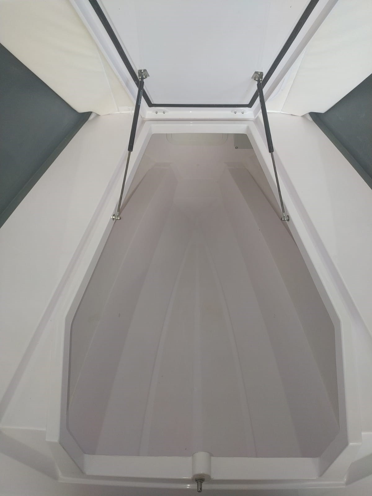La posizione della seduta di guida è estremamente confortevole e tramite il doppio sedile reclinabile permette di guidare in piedi o da seduti, mantenendo sempre un'ottima visuale in navigazione. La seduta ospita un frigorifero inox da 50lt, un lavello inox e a scelta un fornello a gas o elettrico.