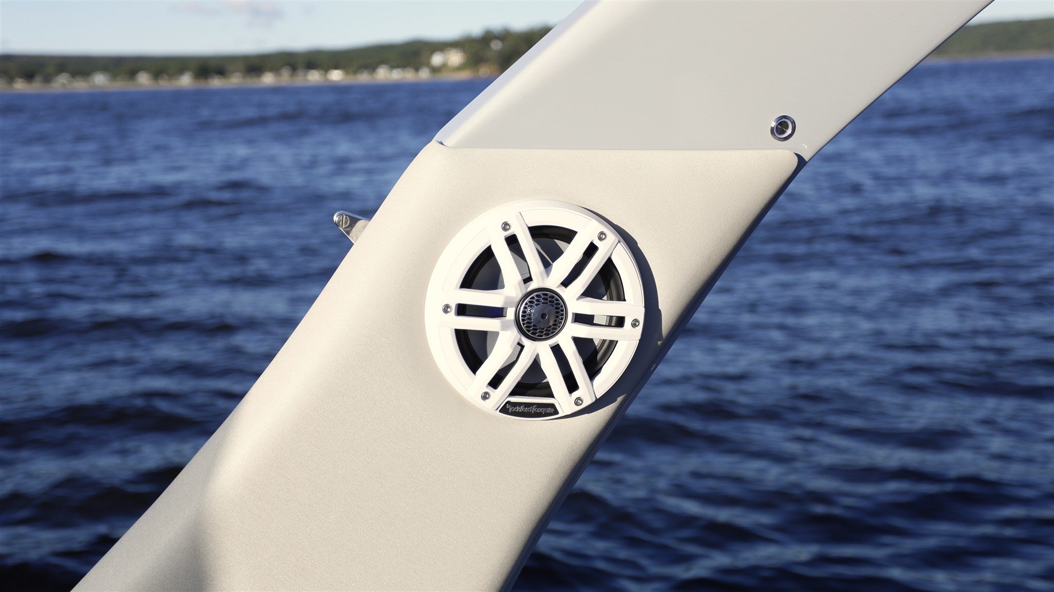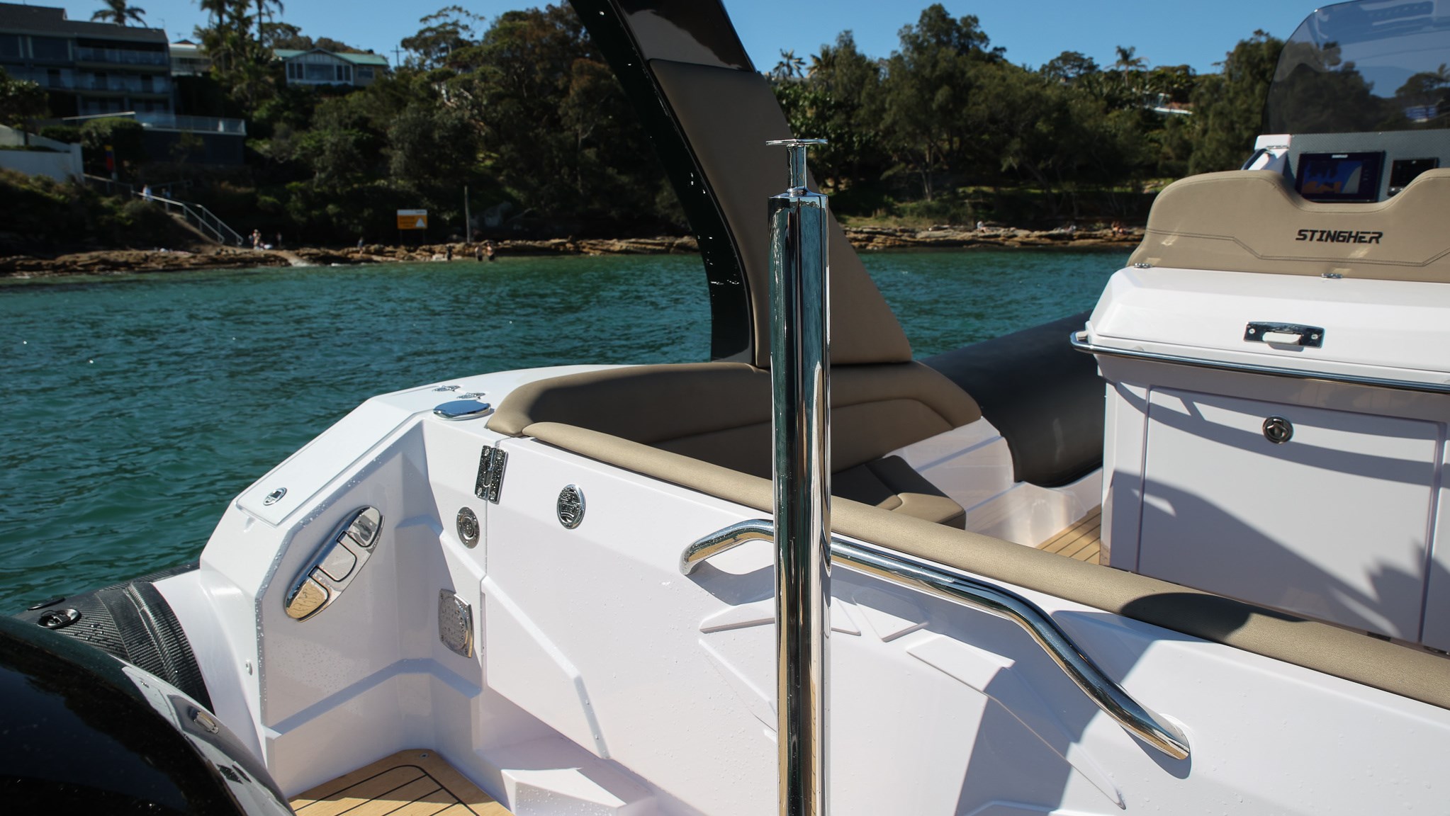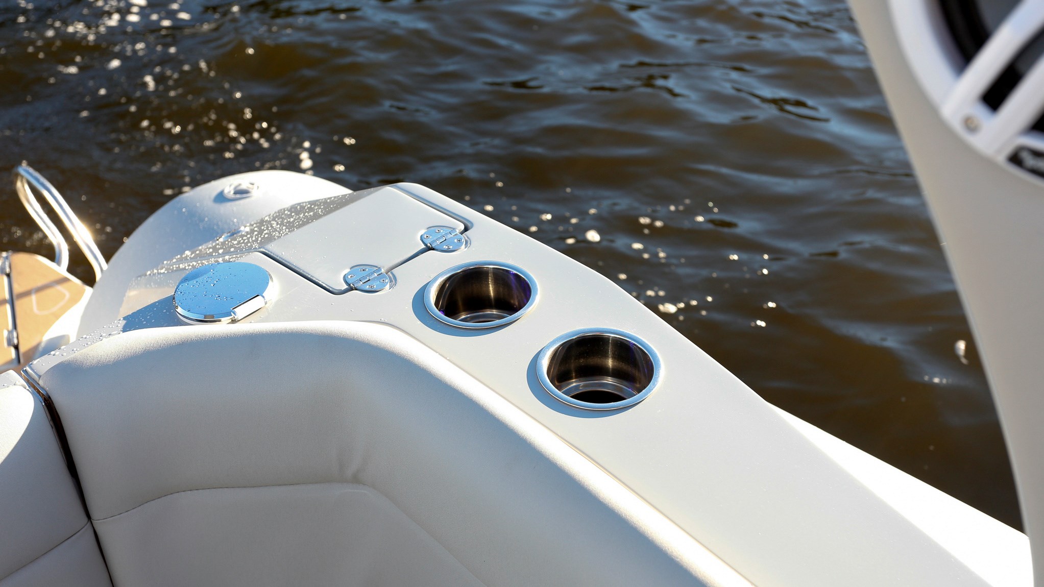 La consolle di guida è dotata di un ampio cruscotto per l'installazione di strumenti di navigazione come GPS fino a 12", radio VHF, stereo e altri controller, frontalmente ha un'ampia porta con seduta integrata, che aprendosi rivela una zona toilette / spogliatoio completa di wc con scarico elettrico e doccia a cielo.