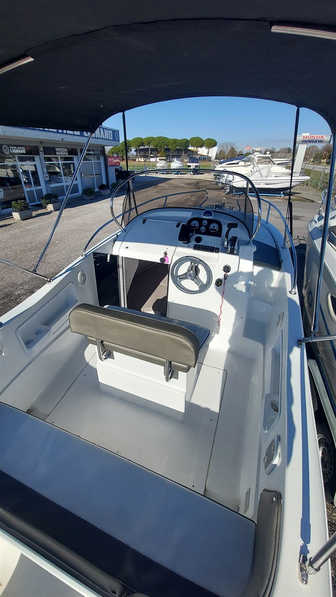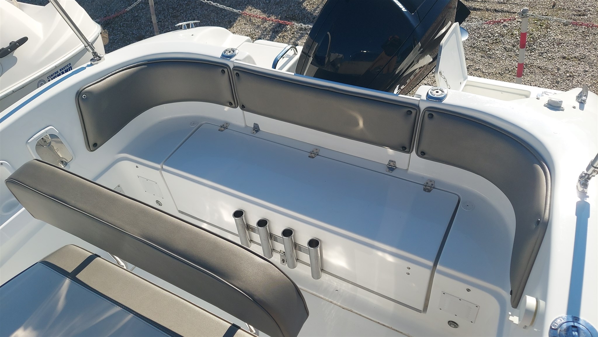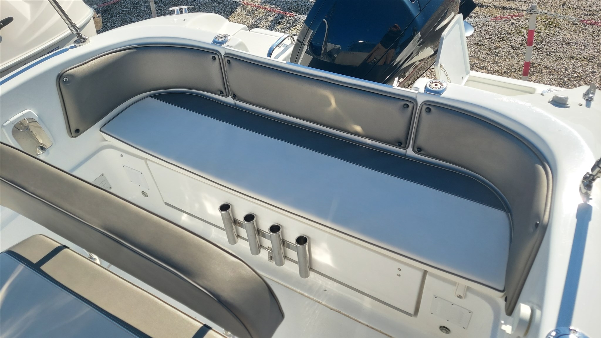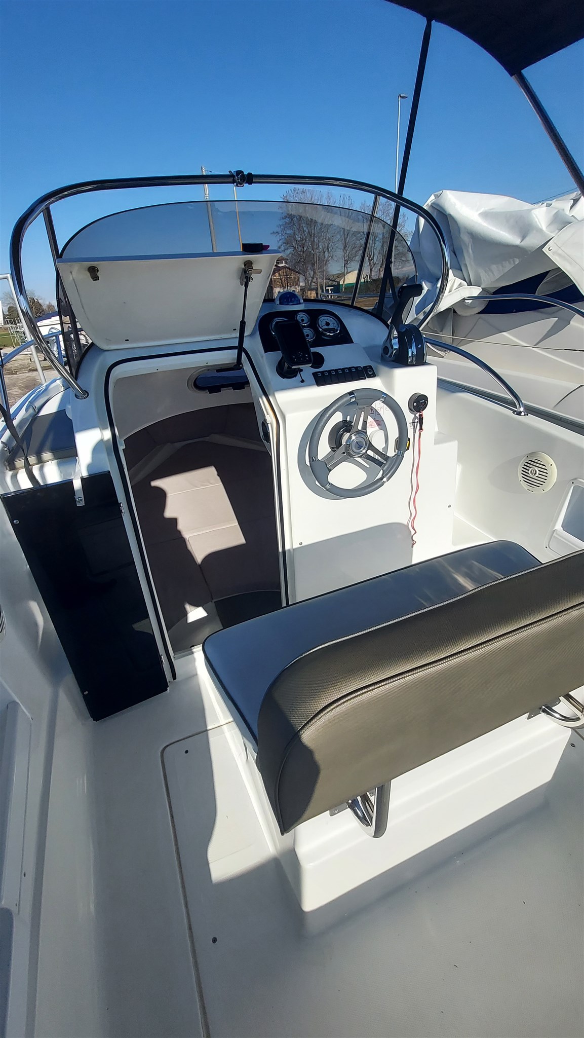 Cabina con 2 posti letto con cuscinerie complete interne perfette e profumate, zanzariera oblò, Garmin trasduttore ecoscandaglio removibile su staffa, no WC, impianto stereo con2 casse, cuscinerie esterne perfette pari al nuovo, seduta di guida apribile con ampio gavone, impianto elettrico doppia batteria 12V con scatole stagne, scaletta a mare telescopica, vasca a poppa per il pescato, porta canne (4) in acciaio, tasche laterali porta oggetti, ventilatore gavone poppa, serbatoio acqua e doccetta, luci di navigazione regolamentari, tendalino autoportante in acciaio inox con custodia (perfetto), verricello elettrico con ancora e catena e doppio comando, telo copri console, telo copertura totale con cerniera al centro, tientibene laterali in acciaio inox. Altro in visita presso nostro cantiere Centro Nautico Lignano. Info dirette 3474077005,