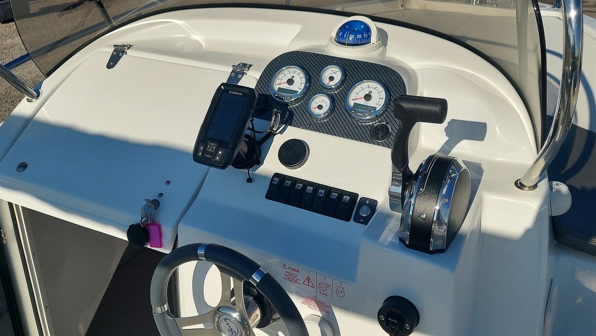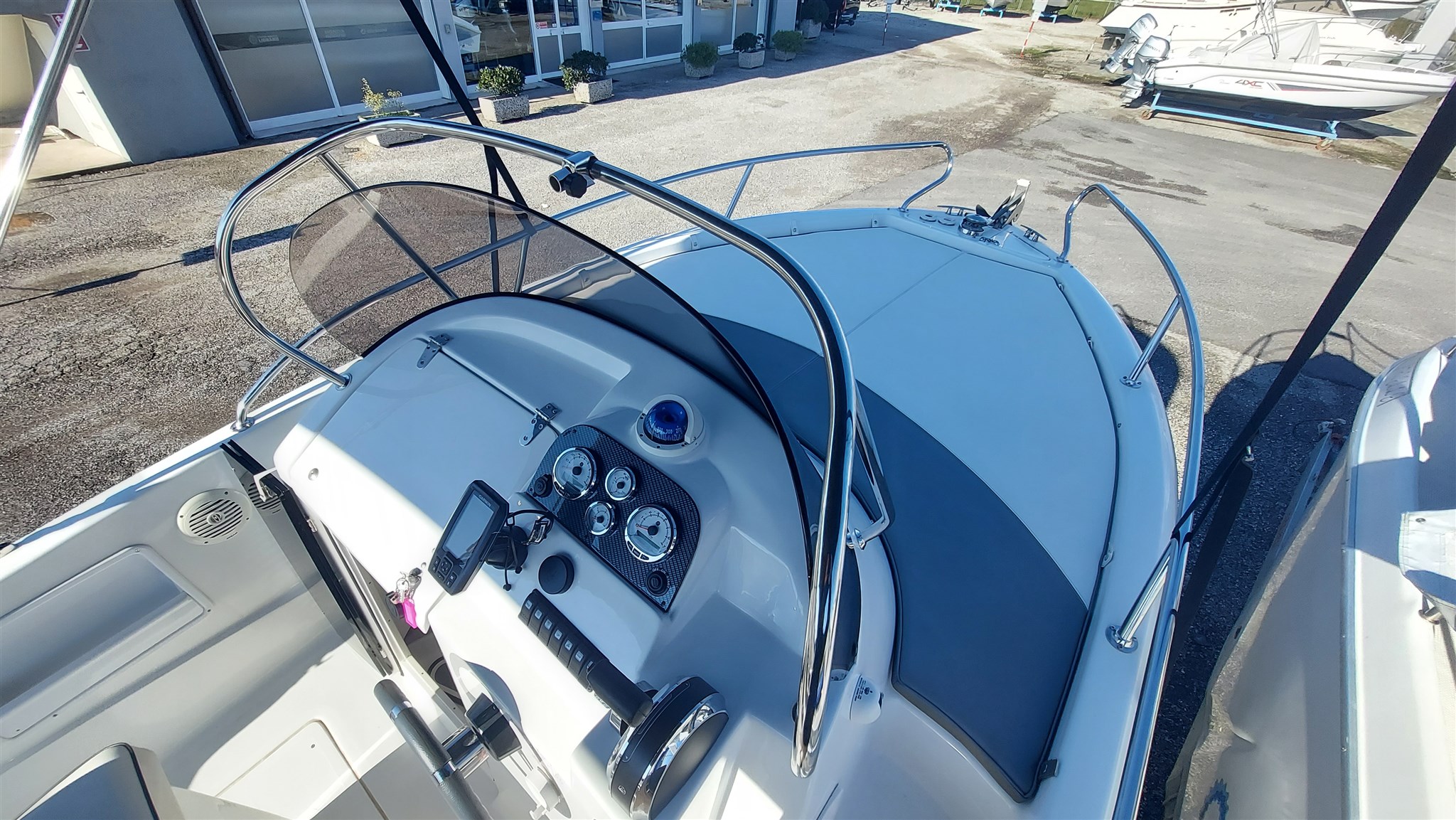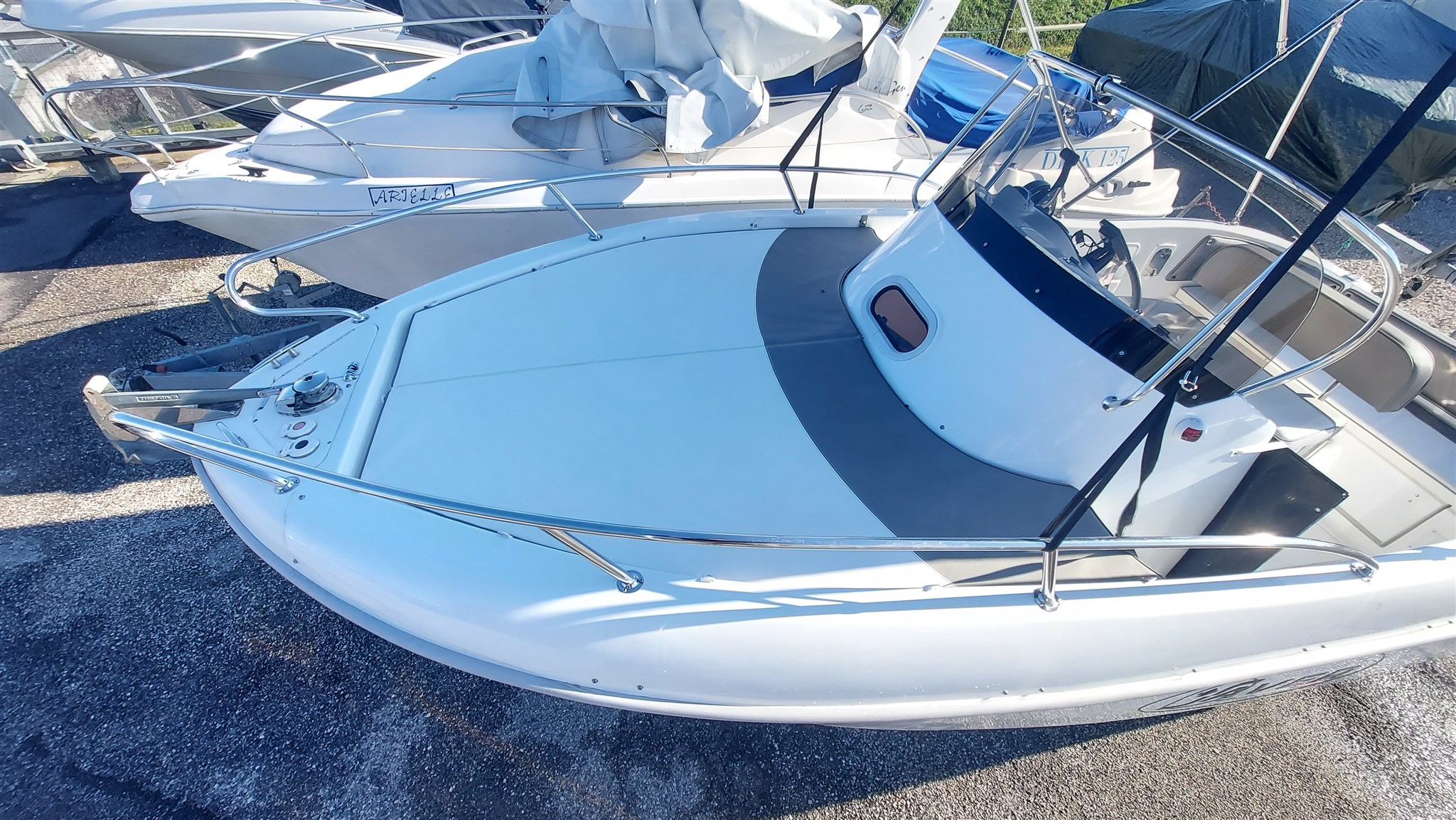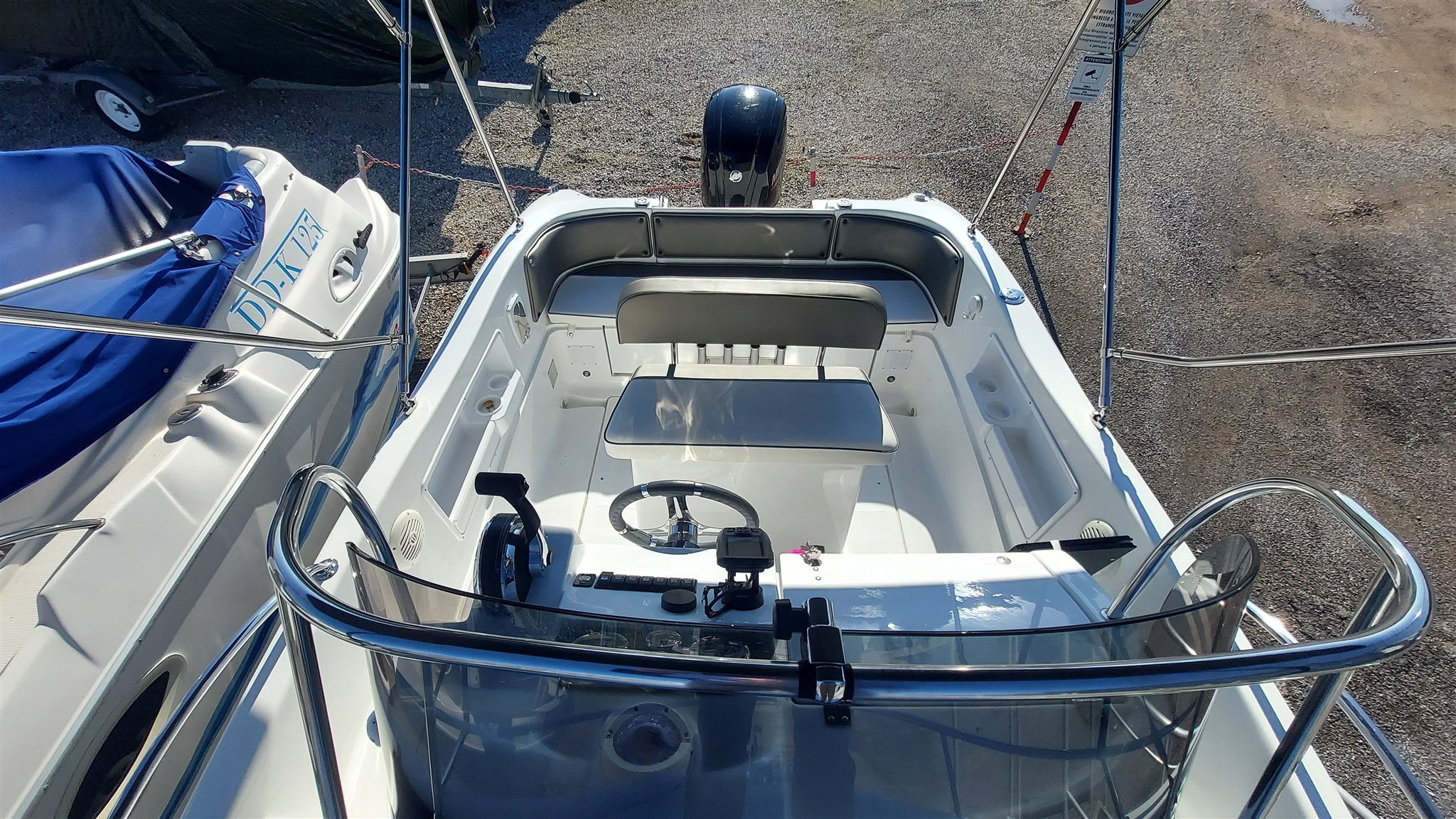 Cabina con 2 posti letto con cuscinerie complete interne perfette e profumate, zanzariera oblò, Garmin trasduttore ecoscandaglio removibile su staffa, no WC, impianto stereo con2 casse, cuscinerie esterne perfette pari al nuovo, seduta di guida apribile con ampio gavone, impianto elettrico doppia batteria 12V con scatole stagne, scaletta a mare telescopica, vasca a poppa per il pescato, porta canne (4) in acciaio, tasche laterali porta oggetti, ventilatore gavone poppa, serbatoio acqua e doccetta, luci di navigazione regolamentari, tendalino autoportante in acciaio inox con custodia (perfetto), verricello elettrico con ancora e catena e doppio comando, telo copri console, telo copertura totale con cerniera al centro, tientibene laterali in acciaio inox. Altro in visita presso nostro cantiere Centro Nautico Lignano. Info dirette 3474077005,