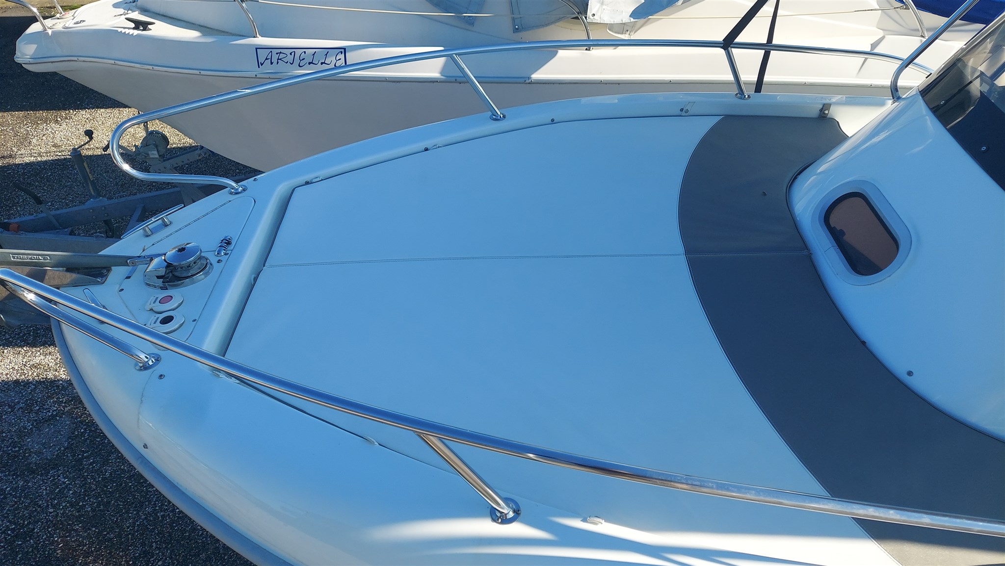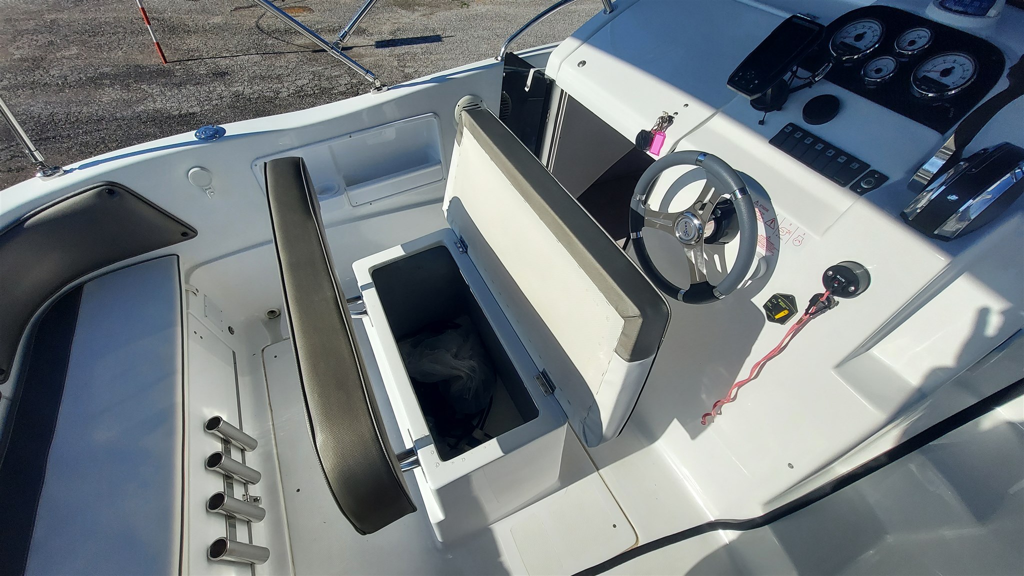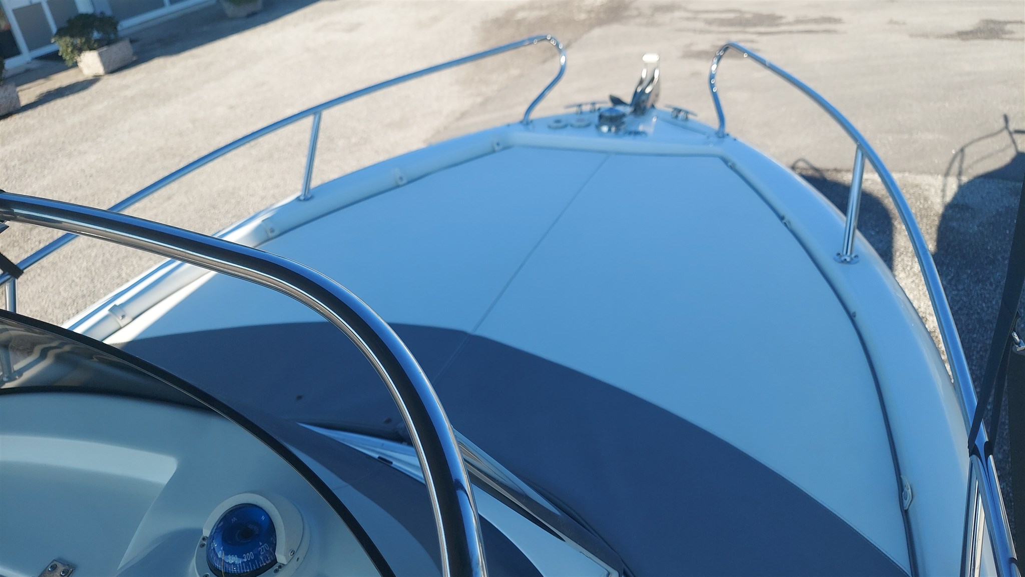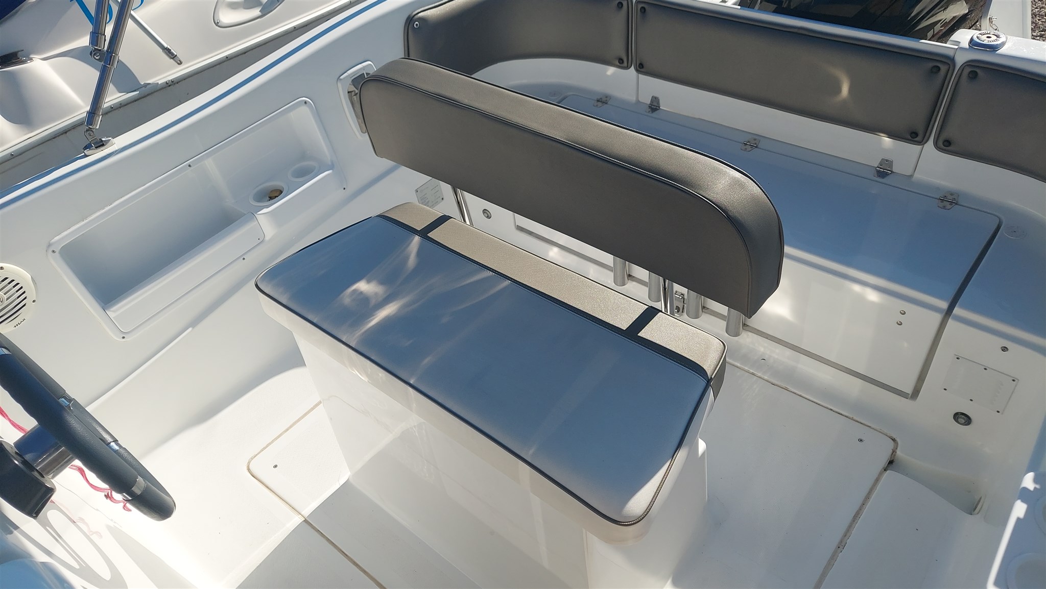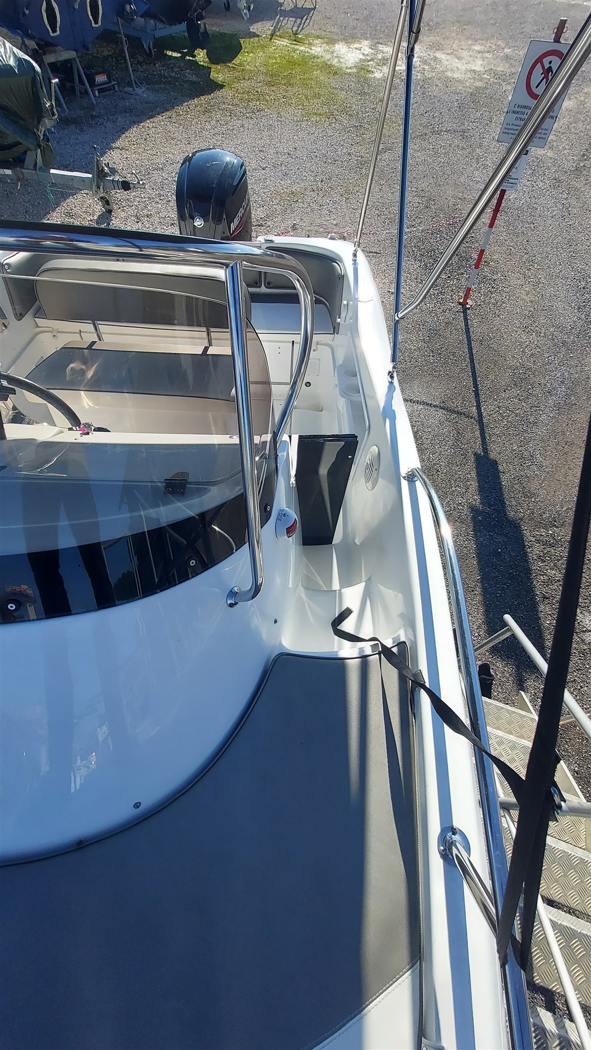 Cabina con 2 posti letto con cuscinerie complete interne perfette e profumate, zanzariera oblò, Garmin trasduttore ecoscandaglio removibile su staffa, no WC, impianto stereo con2 casse, cuscinerie esterne perfette pari al nuovo, seduta di guida apribile con ampio gavone, impianto elettrico doppia batteria 12V con scatole stagne, scaletta a mare telescopica, vasca a poppa per il pescato, porta canne (4) in acciaio, tasche laterali porta oggetti, ventilatore gavone poppa, serbatoio acqua e doccetta, luci di navigazione regolamentari, tendalino autoportante in acciaio inox con custodia (perfetto), verricello elettrico con ancora e catena e doppio comando, telo copri console, telo copertura totale con cerniera al centro, tientibene laterali in acciaio inox. Altro in visita presso nostro cantiere Centro Nautico Lignano. Info dirette 3474077005,
