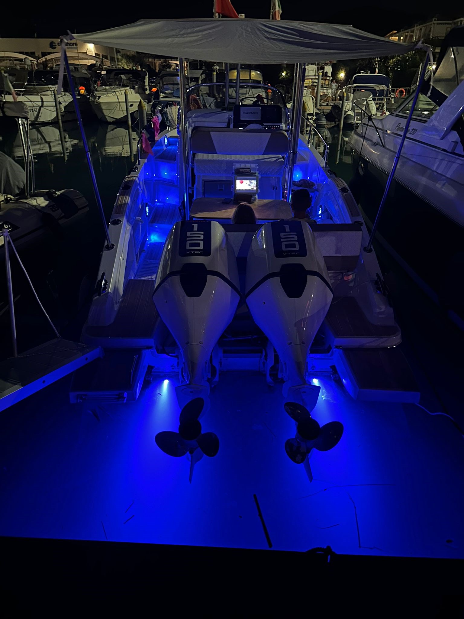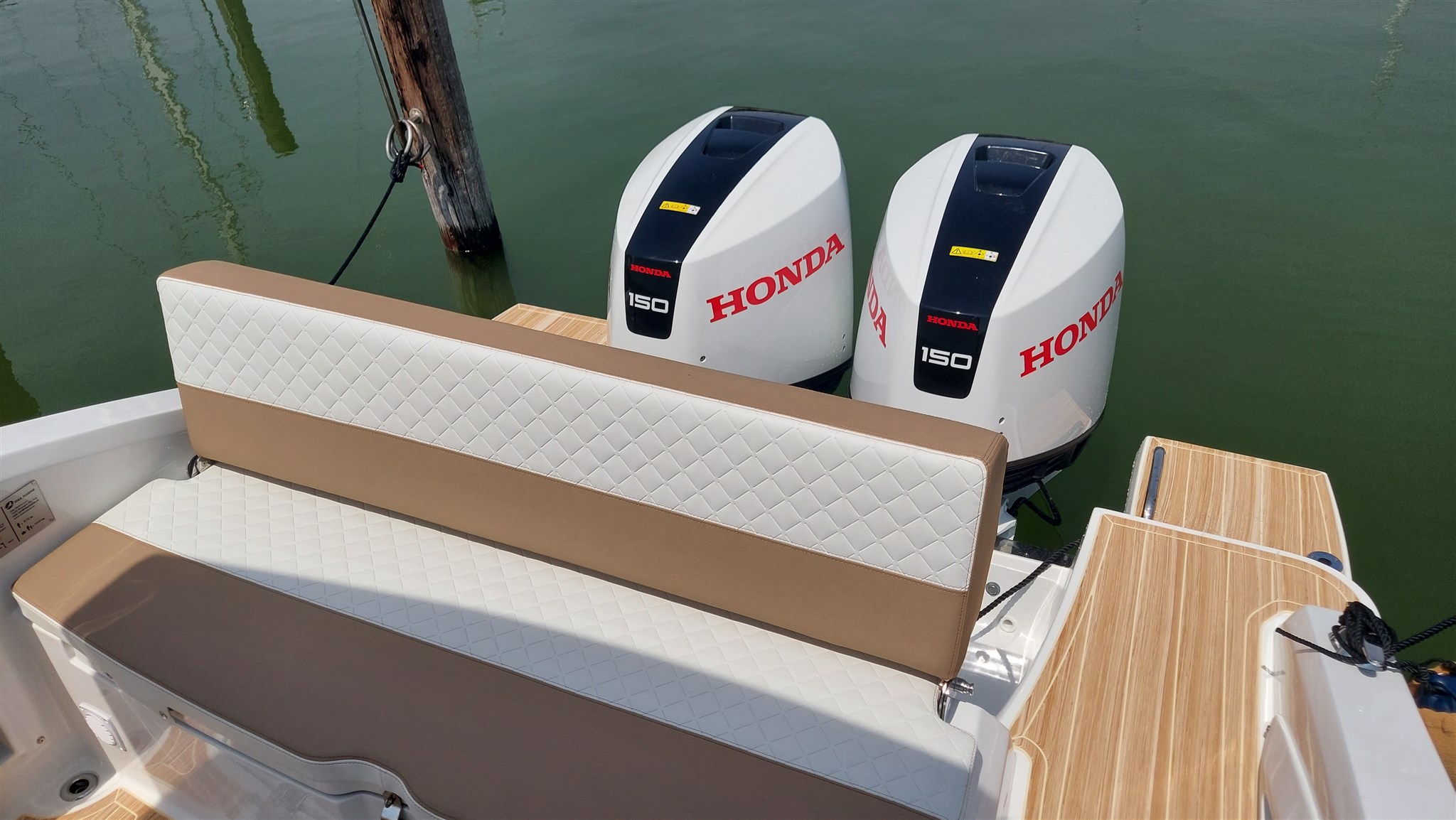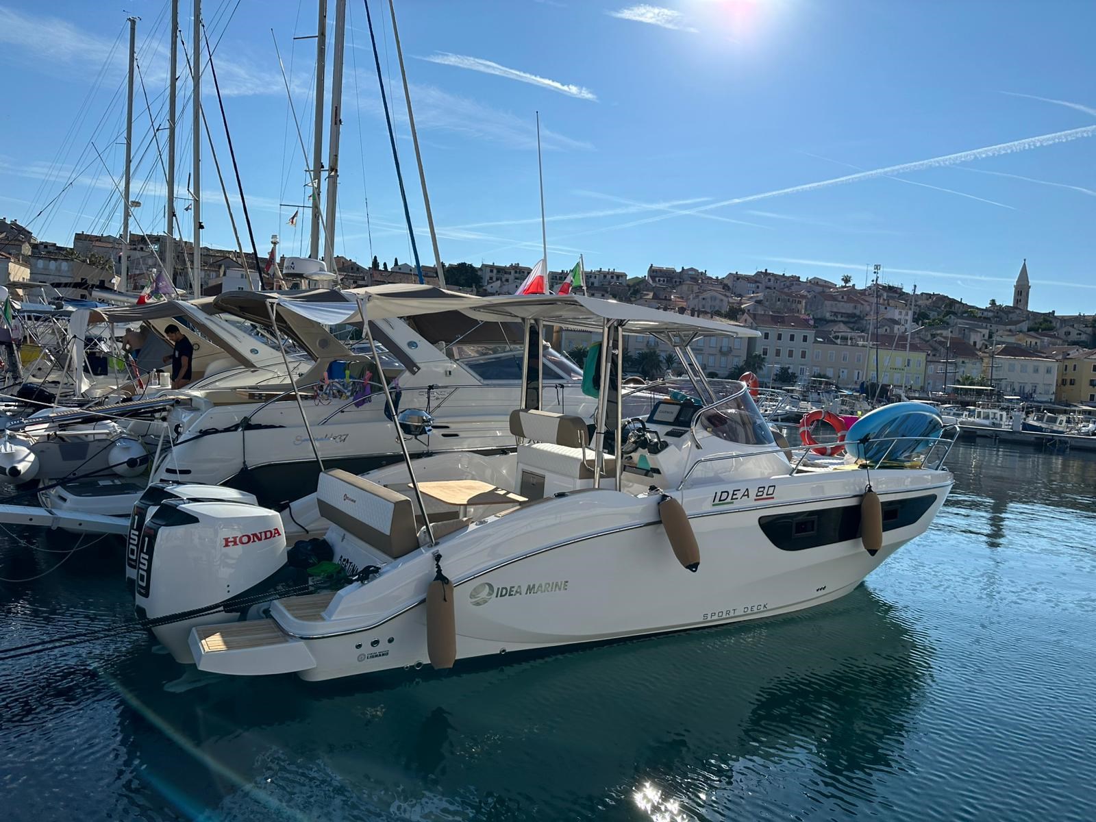 Barca natante Idea Marine 80 WA T-Top anno 2024, motori 2 Honda Marine BF150 elettronici colore Sporty White con 105 ore di moto, perfetta, versione T-top, full teak sintetico. Barca da 37/38 di massima e crociera 25/27 nodi, consumi 35 litri ora a 21 nodi (totali!). Barca completa di impianto GPS Garmin Echomap 92 UHD2, trasduttore GT56 Side View, carta nautica Adriatico, radio VHF 2024, impianto doppia batteria, impianto flaps automatico con sistema Mente Marine, impianto stereo Fusion con 4 altoparlanti, luci di cortesia pozzetto BLU, luci subacquee BLU, prese 12V, prese USB, prese 220V. Pavimenti esterni e interni in teak sintetico speciale Gomma Deck.